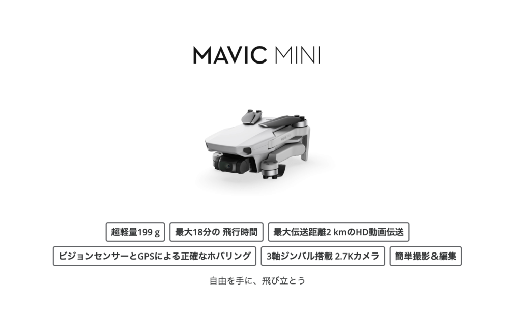 DJIから、重さ199グラムの超小型ドローン、DJI Mavic Mini が発売される。