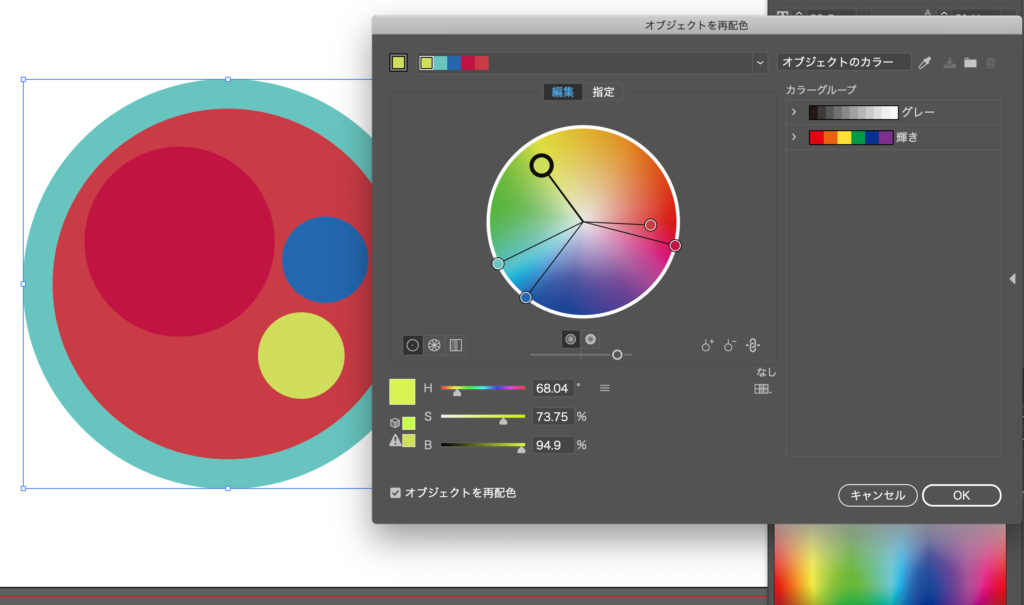 小さな円を全部黄色よりに変更してみました。こんな感じで色をどんどん変更できます。