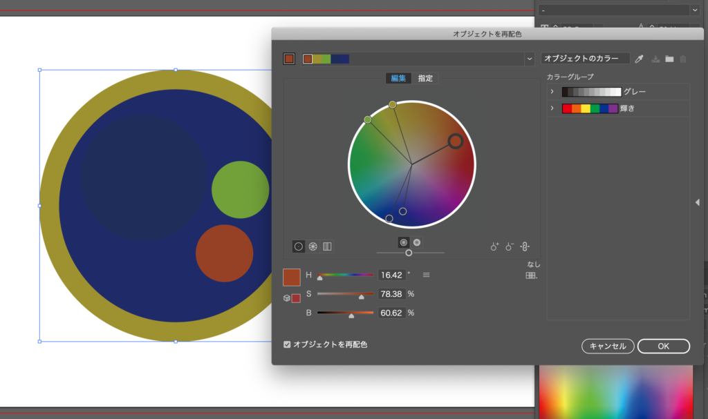 この色を変更したいオブジェクト全てを選択して、『編集→カラーを編集→オブジェクトを再配色』を選択。
