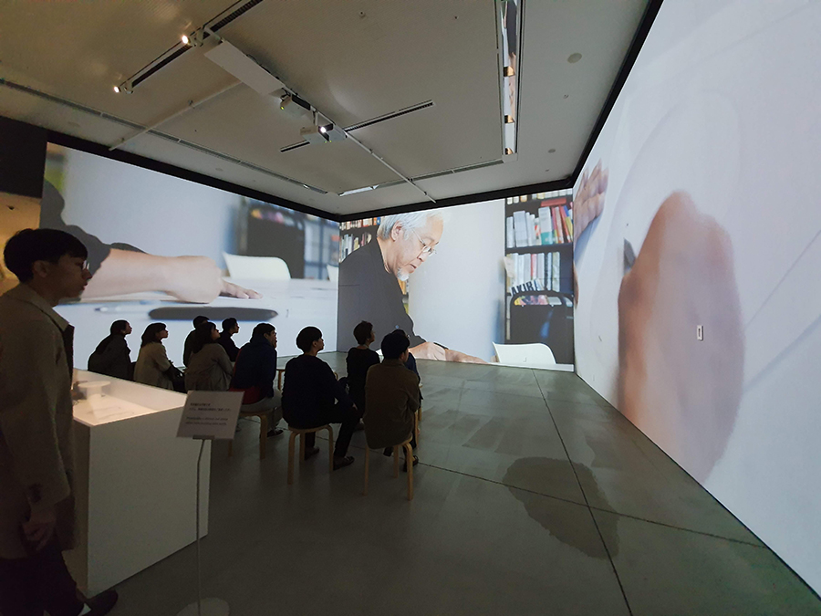 まず会場で私たちを驚かせてくれるのは、デザイナー達の作業風景が3面に渡って展示されている映像鑑賞スペースです。原研哉や山中俊治などの作業風景をじっくりと鑑賞できます。