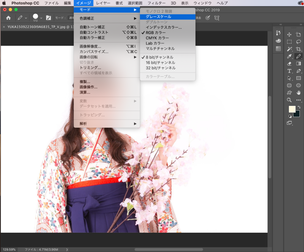 グレースケールにカラーモードを変更してから、もう一度『イメージ → モード → 今度は モノクロ2階調』を選択します。このままデータをPsd形式で保存してください。