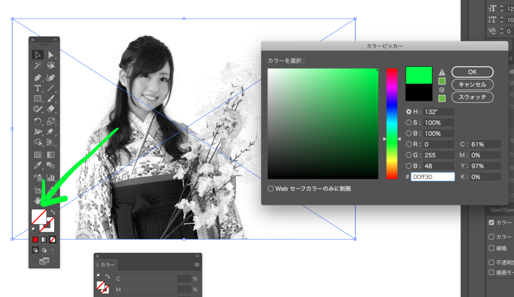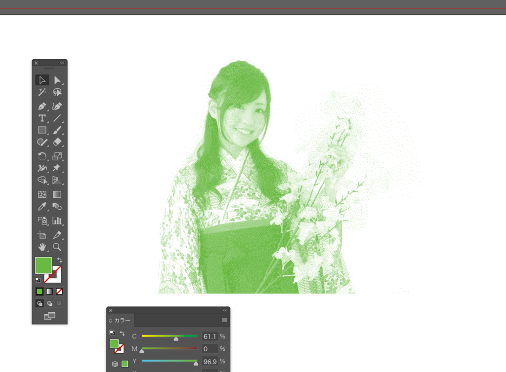 Photoshopデータですが、イラレ上での色調整が可能になりました。今回は女性の写真を使いましたが、テクスチャ等でも応用可能です。是非試してみてください。
