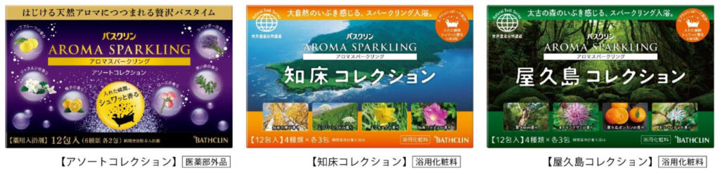 おすすめの入浴剤は、バスクリンアロマスパークリングシリーズ。特に屋久島コレクションや知床コレクションがおすすめです。屋久島ポンカンや屋久杉の香りをおうちで手軽に楽しめます。