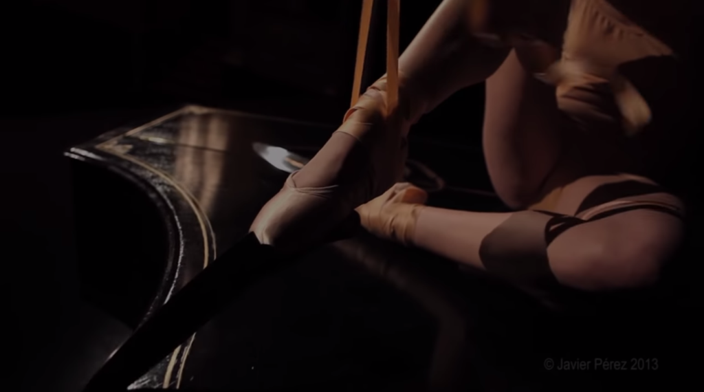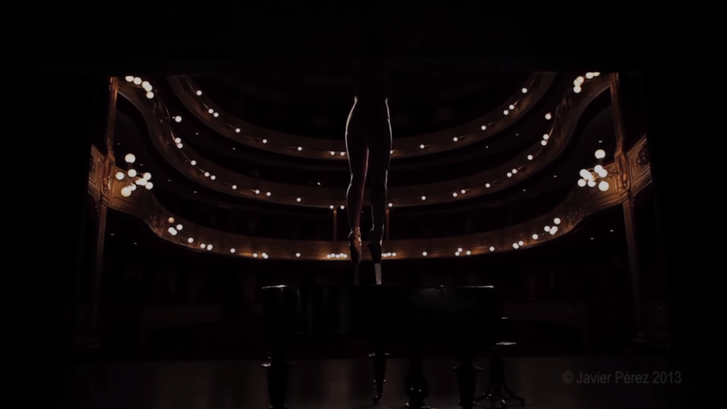 バレリーナは、完璧を求めて努力、犠牲、痛みを表現する不気味な姿として現れます。最初は恥ずかしがりやためらいがちでしたが、彼女のステップはますます強調され、威嚇し、暴力をためらわず、鋭い尖った靴でピアノの繊細な表面を削り、切り込んでいきます。脆弱から残酷へ変異する様子にココロが奪われます。