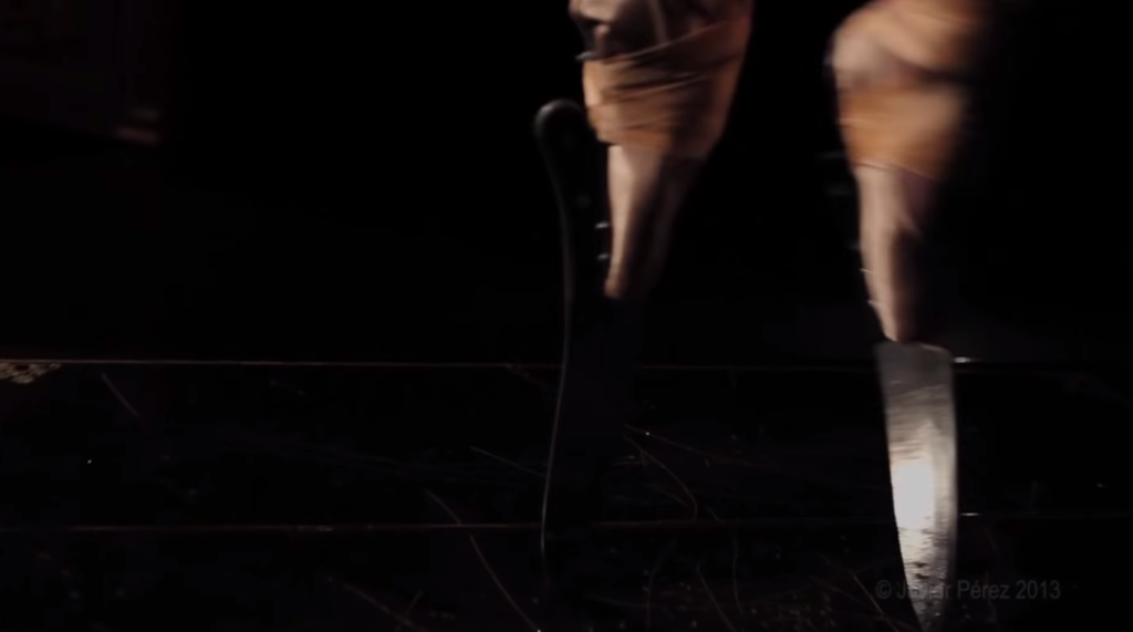 鋭い包丁をつけたトーシューズを履いて踊るバレリーナ。ステージに置かれたグランドピアノの蓋の上でバランスを保つために戦い、疲れ果てるように執拗に踊り回ります。スペイン在住のアーティスト、Javier Perez氏のEN PUNTAS という作品。