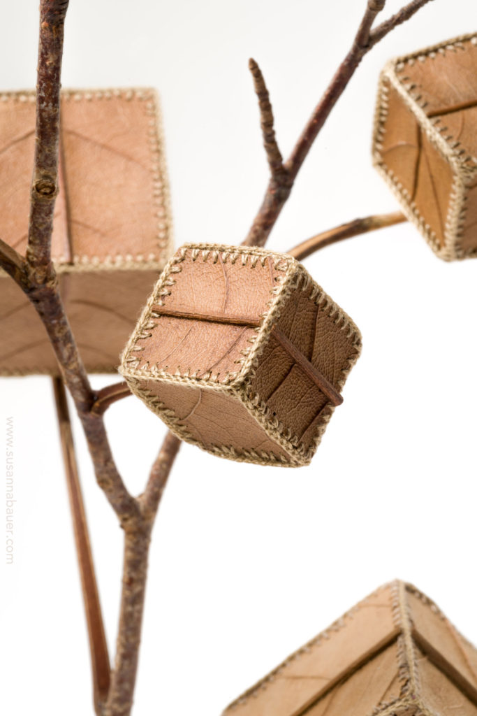スザンナ氏の仕事には、脆弱性と強さの間に素晴らしいバランスがあります。繊細な糸を脆い葉や薄い乾燥した木片に引っ張るという作業は、人間のつながりの優しさと緊張、一時的で永続的な自然の美しさを表現しています。