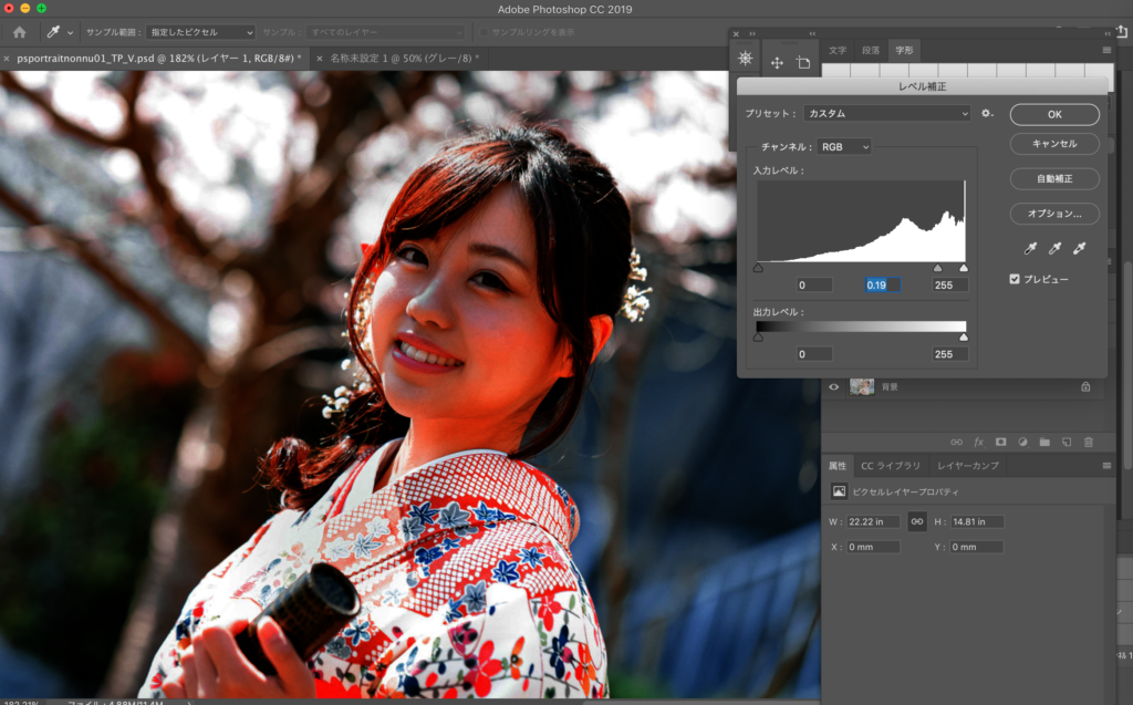 複製したレイヤーにレベル補正をかけます。 今回の数値は、左から0, 0.19,255です。