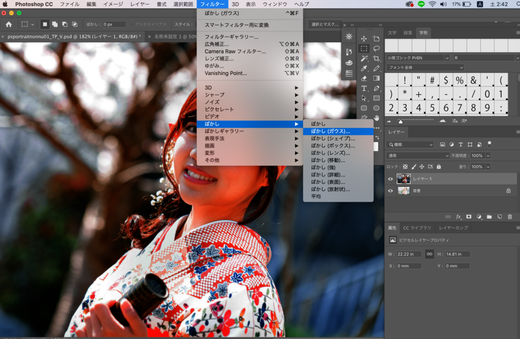 今、レベル補正をかけたレイヤーに『フィルター → ぼかし → ガウス』をかけます。