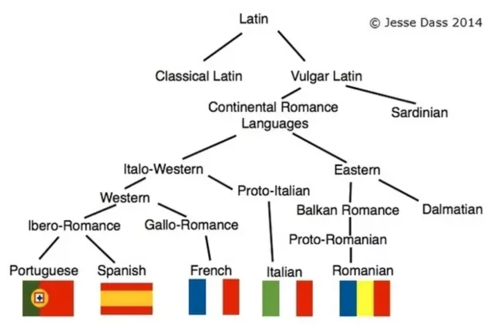 口語は中世期に多様に変化し、イタリア語やフランス語、スペイン語などの多様なラテン言語が生まれた。つまりこれらの言語は、そもそもは古代ローマ帝国で話されたラテン語のなまり。イタリア語とスペイン語はフランス語は似ていると言われる訳はここにある。
