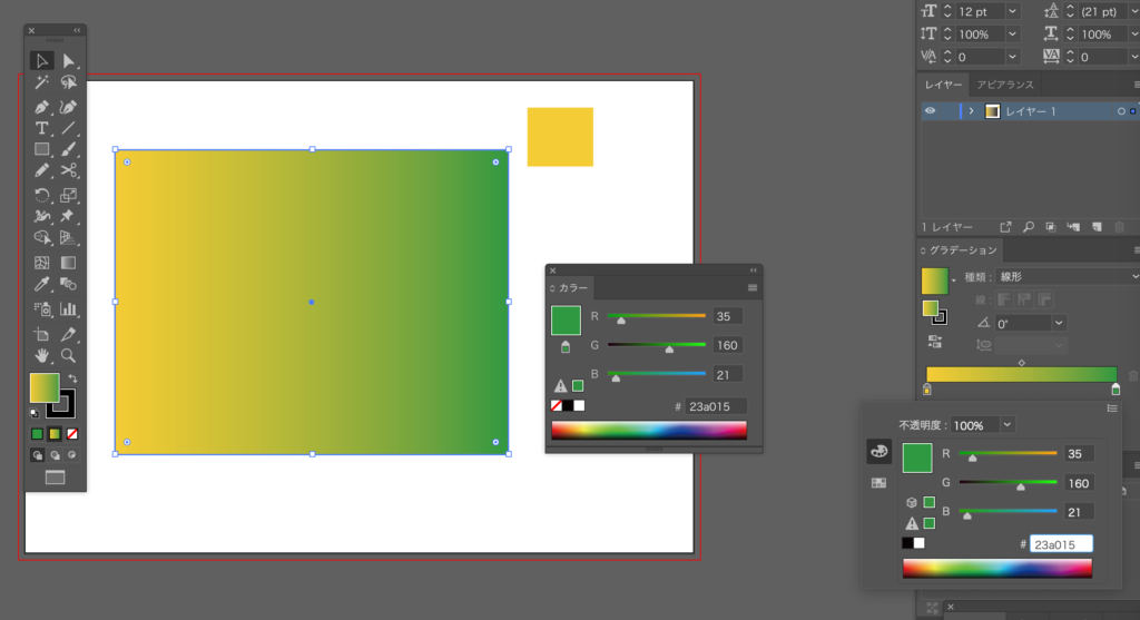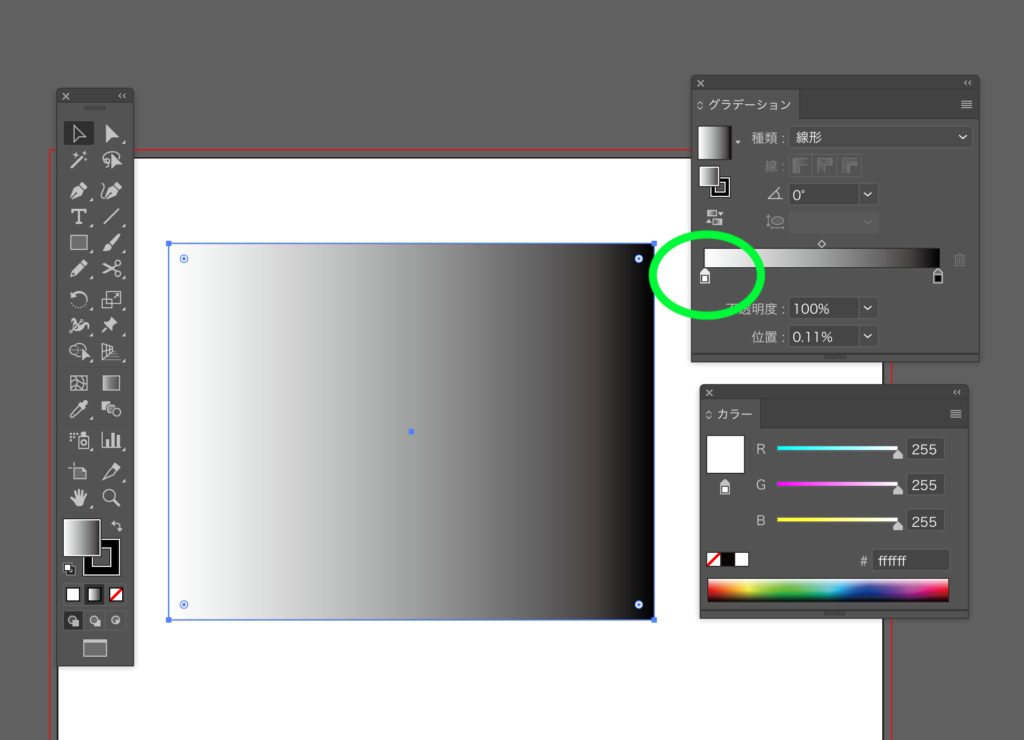 色の変更をしたいオブジェクトを選択した状態で、グラデーションスライダーの両端にある小さなカラーボックスを選択します
