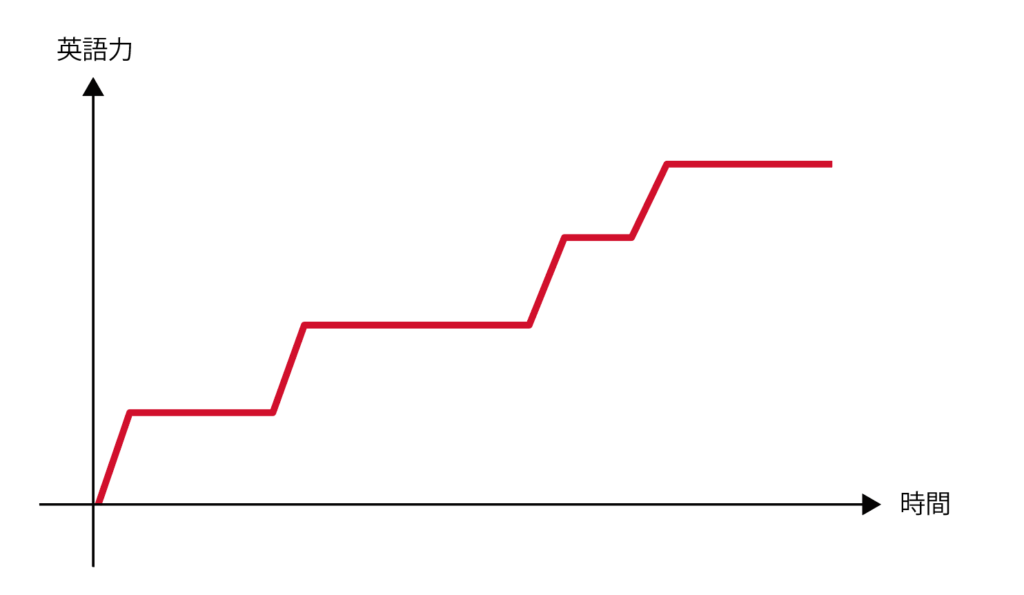 成長曲線には様々タイプがあるのだが、有名なのは英語学習の成長曲線だ。単純な比例グラフとして、時間と共に成長するのではなく、段階的に成長していくことがわかる。