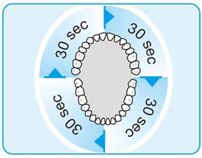 オーラルbにはブラシが30秒に一回ずつ止まるタイマーがついています。口の中を4分割して左下(30秒)・右下(30秒)・左上(30秒)・右上(30秒)の合計2分で磨き残しなく、歯を傷めずに短時間で磨けるのがオススメ。