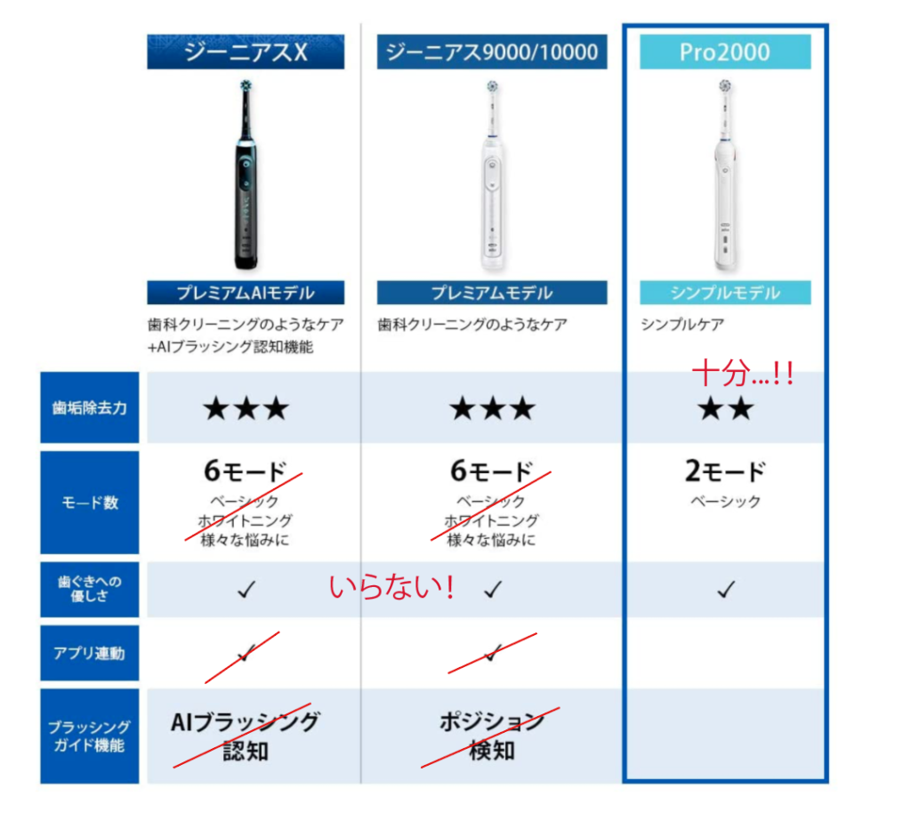 これより下位だと機能が不十分だし、これより上位でも「ホワイトニングやらそんなにモードいらないよ!」となるからPRO2000をオススメします。