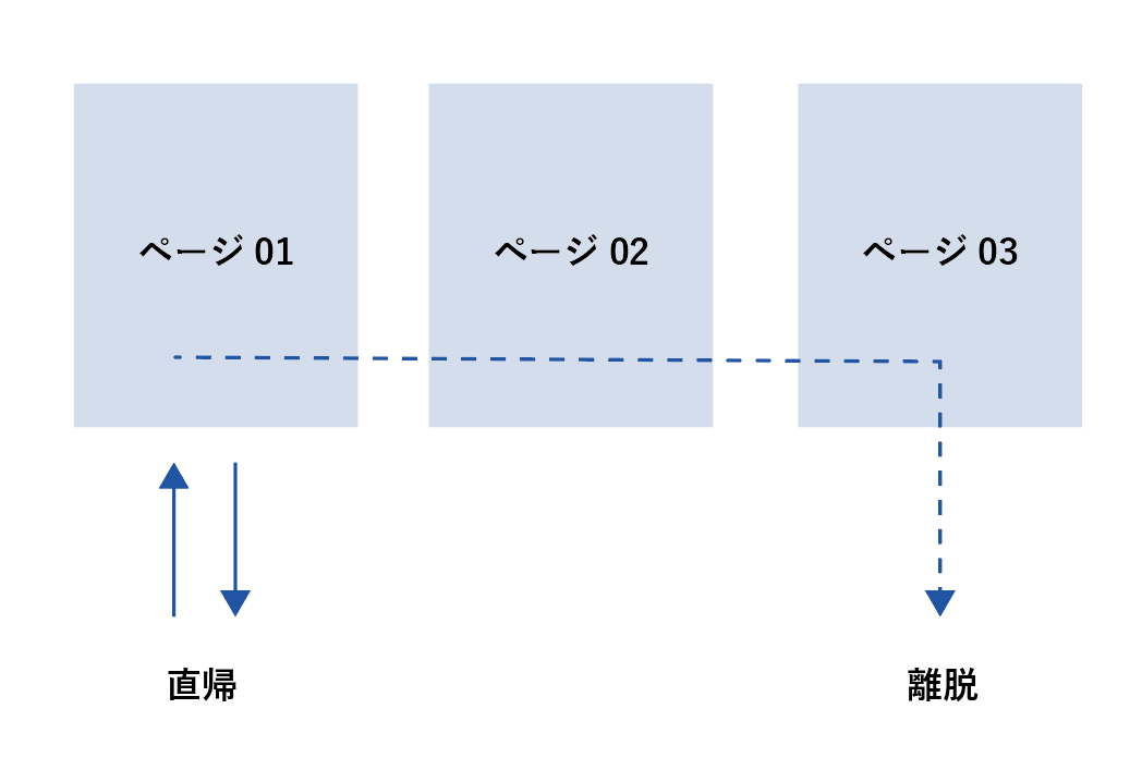 webサイトにおいて、サイトを訪れてそのページだけ見てセッションが終了した場合を直帰。数ページ見てからセッションが終了した場合を離脱という。直帰率は、英語ではbunce rate(バウンスレート)と呼び、スーパーボールが跳ね返るイメージが容易に想像着くはずだ。