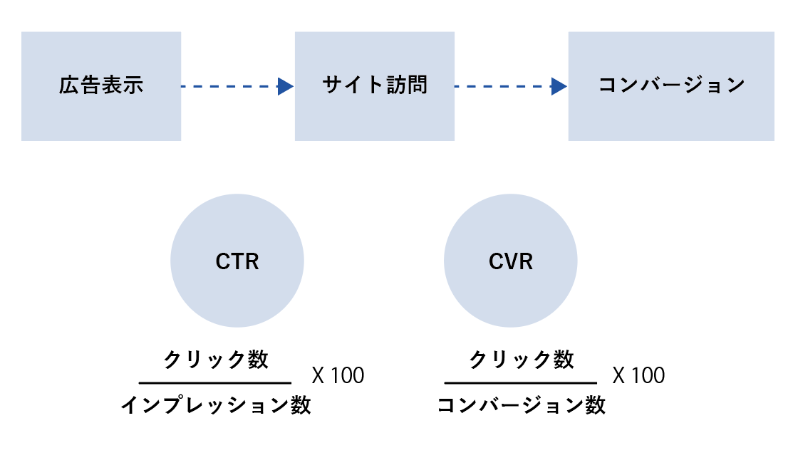 広告のインプレッション(表示回数)に対して、その広告が何回クリックされたのか割合を示すのがCTR。広告をクリックして購入や契約に至った場合、クリックに対してどれだけの購入があったのかを示すのがCVRだ。