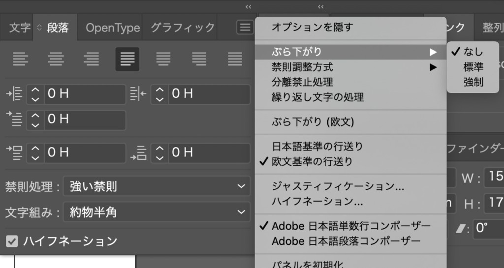 解決方法は、テキストボックスを選択した状態で、ウィンドウ→段落→オプションを表示(ウィンドウの右上)。ここでぶらさがり設定「なし」を選択する。