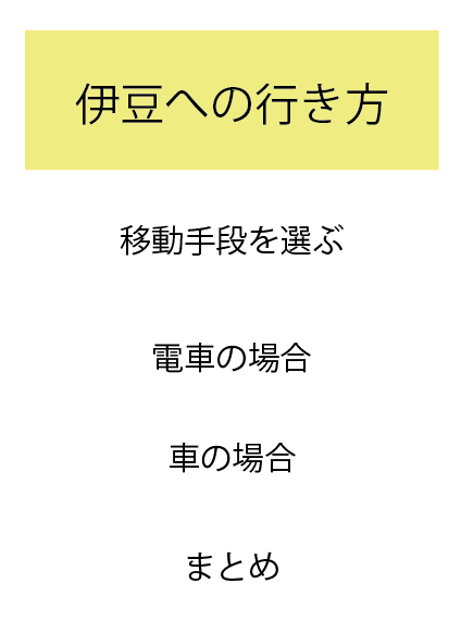 こういったブログは意外と多いです。例えばこのブログの筆者が電車好きの場合、「電車の方が気になる人多いだろう!!うん、絶対そう!!」みたいな解釈をしてしまい、移動手段の紹介の前に電車の場合の話をしてしまい、構成がぐしゃぐしゃっとなってしまいました。「移動手段こんなんありますよ〜〜、じゃあ電車の場合、車の場合〜〜」という自然な流れを意識しましょう。