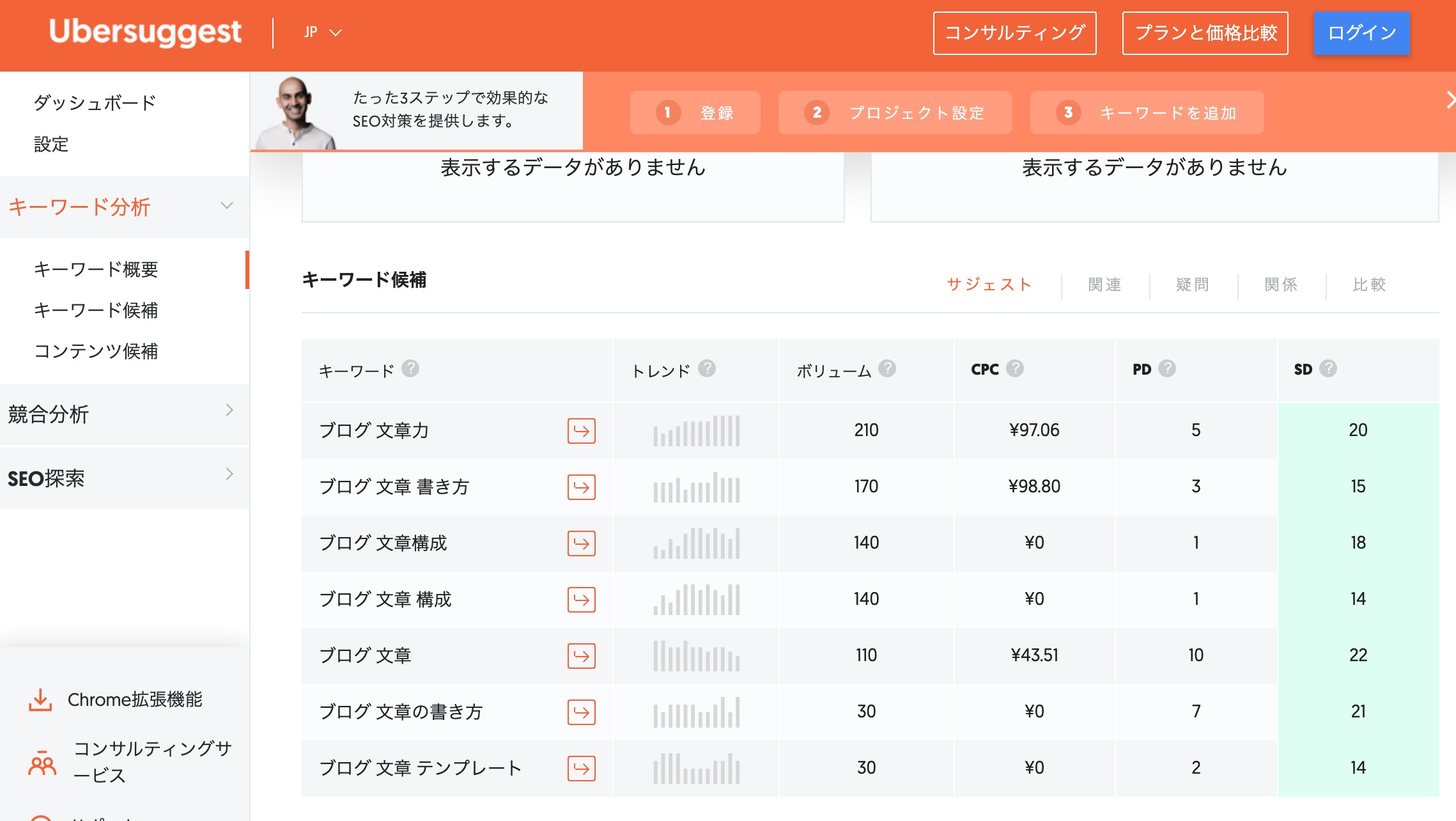 余談ですが、このubersuggestで市場調査ができると書きました。adsense収入等を目指して書くのであればこのボリュームでは検索している人が少な過ぎて儲からない。みたいなことも分かります。今回の記事もボリュームが少ないので例外無く儲からないでしょう笑(何故書いた!!)