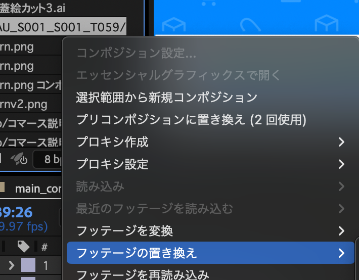 フッテージを置き換えたい時はプロジェクトパネルを右クリックして、