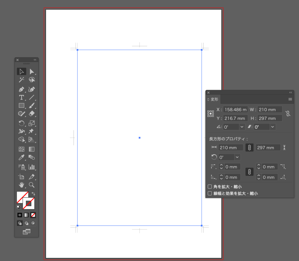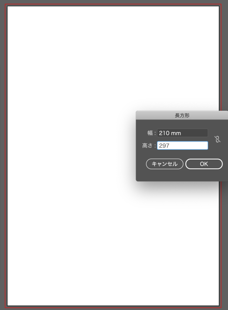長方形ツールを選択した状態で、アートボードをダブルクリック。A4縦サイズの原稿である210mm×297mmで作成してみます。