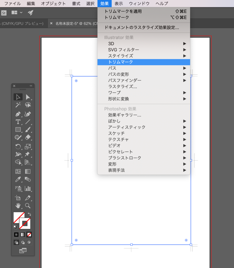 長方形を選択した状態で、『効果 → トリムマーク』を選択。トンボが表示されます。