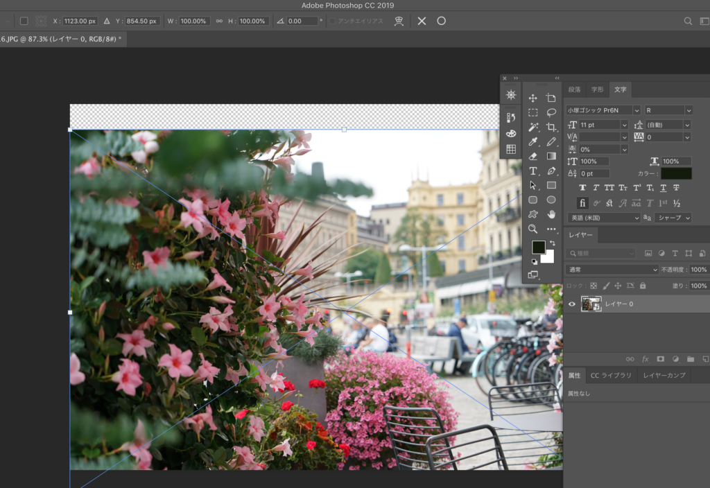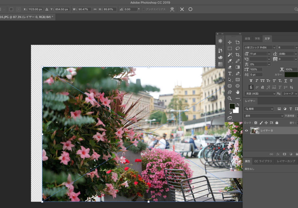 例えば上記の画像、command + tを押してみると、Wが90.47%、H85.91%となっています。本来の画像は100%100%になるはずなので、